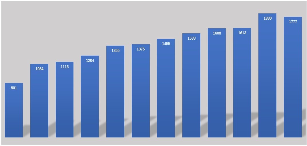 513 | 704 | 727 | 861 | 915 | 981 | 1021 | 1048 | 1119 | 1058 | 1184 | 1191 | 11322 |